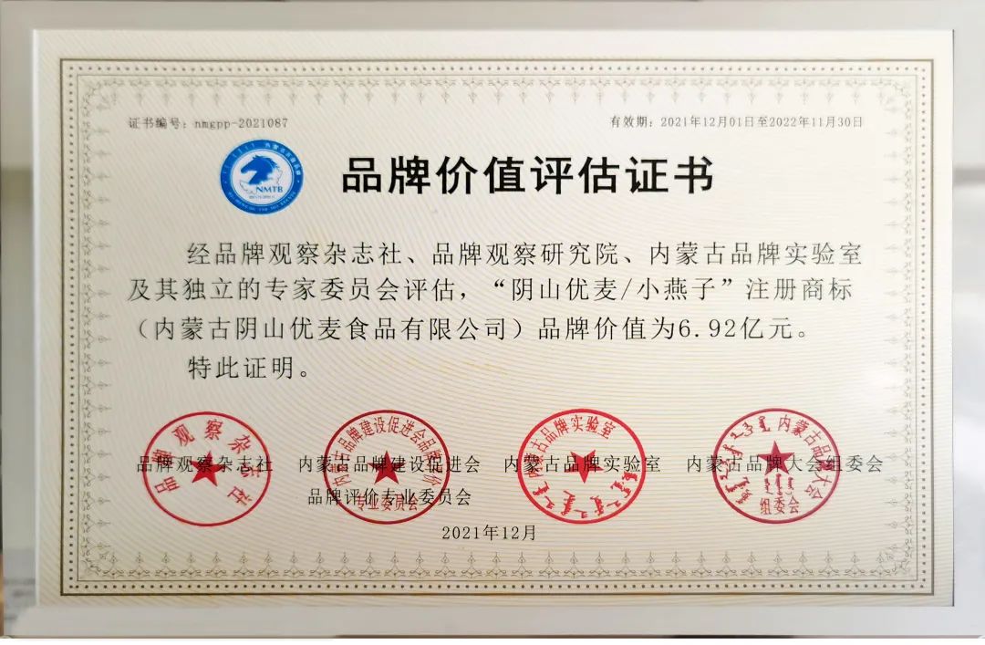 大會(huì)還發(fā)布了2021年度“內(nèi)蒙古百?gòu)?qiáng)品牌價(jià)值評(píng)估報(bào)告”,經(jīng)權(quán)威機(jī)構(gòu)及專家委員會(huì)評(píng)估,陰山優(yōu)麥品牌價(jià)值為6.92億元。